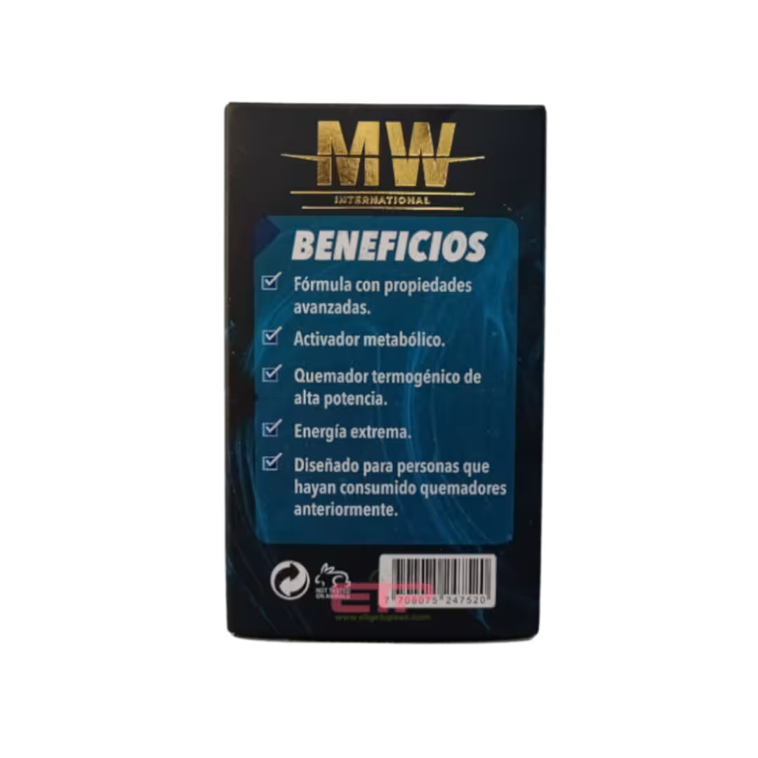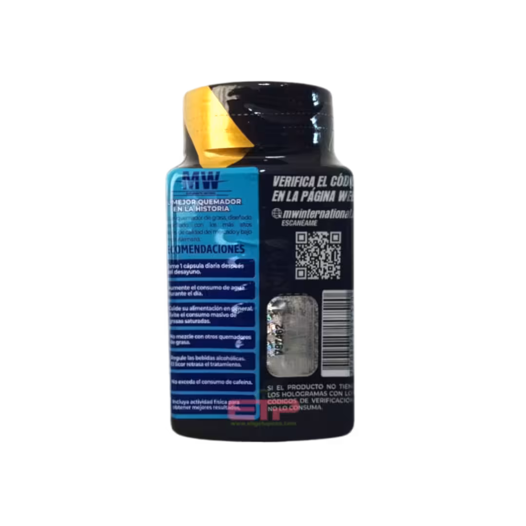 Potente Acción Termogénica: Gracias a su formulación avanzada, MW Gold Fat Burner ofrece una excepcional capacidad termogénica, lo que significa que tu cuerpo puede quemar mas calorías durante el proceso de digestión y metabolización de los alimentos, favoreciendo así la pérdida de peso.