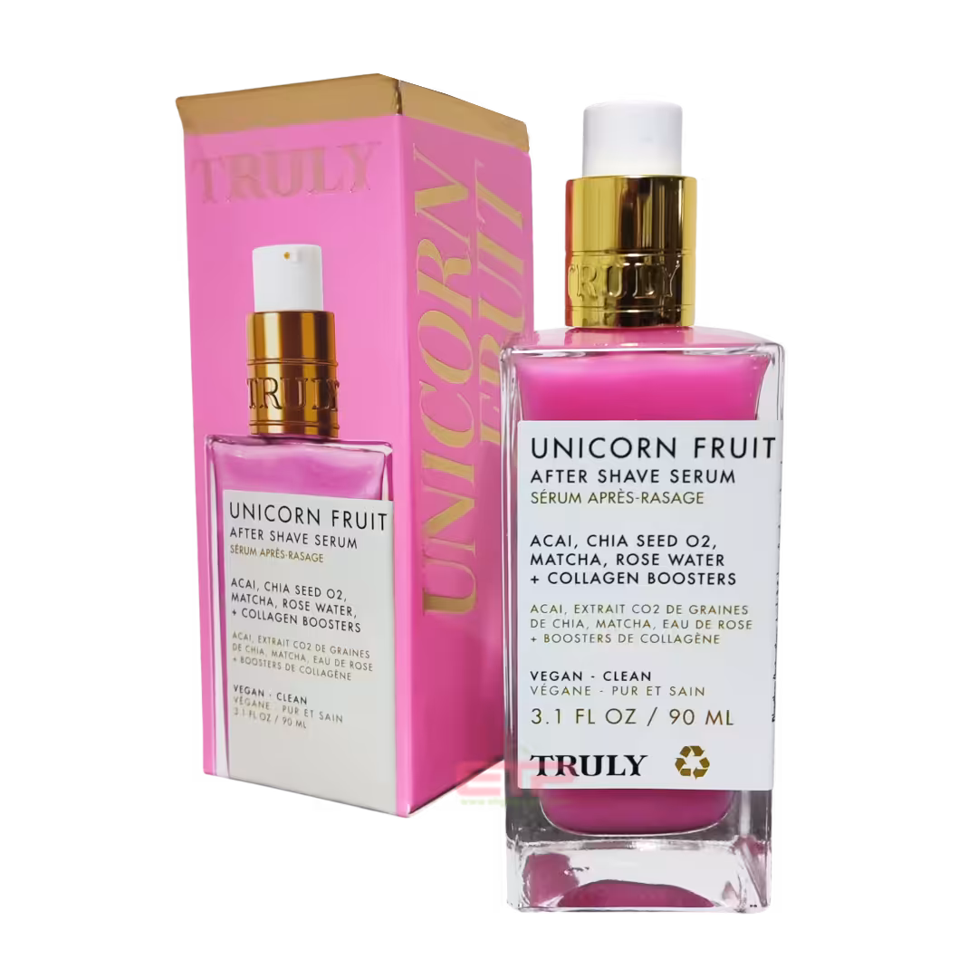 Unicorn Fruit After Shave Serum de Truly está enriquecido con açaí, matcha y agua de rosas para nutrir, proteger y restaurar la barrera cutánea en profundidad, dejando una piel radiante y suave como la seda después del afeitado.